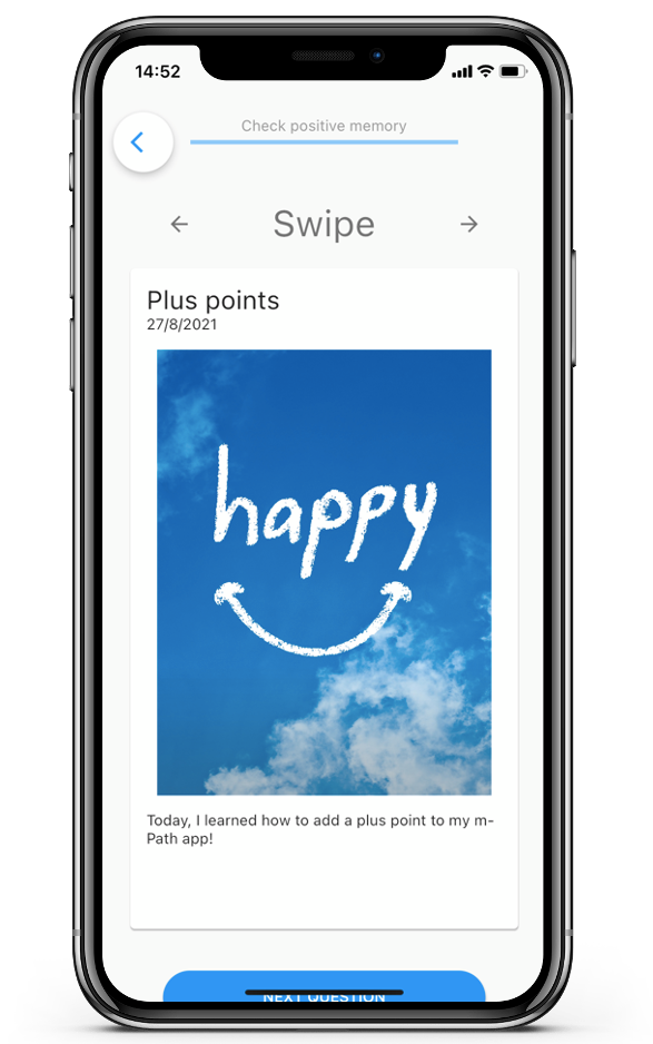 A Check positive memory item can be used to make a client look at his or her plus points. The Check positive memory item will not be displayed as a question, but it will automatically make this screen pop up on the client’s phone: