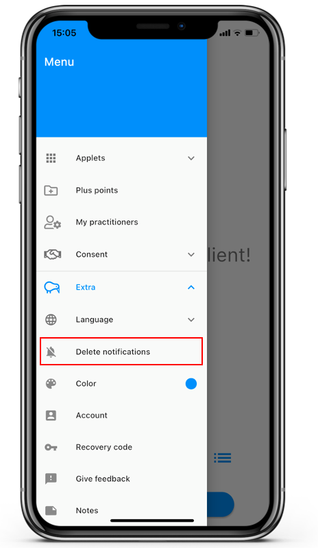 If the client wants to skip a questionnaire or has to many questionnaires in the stack, he or she can remove the stack by tapping on Delete notifications under Extra in the App Settings. We have more information about stacked questionnaires if you want to know more.