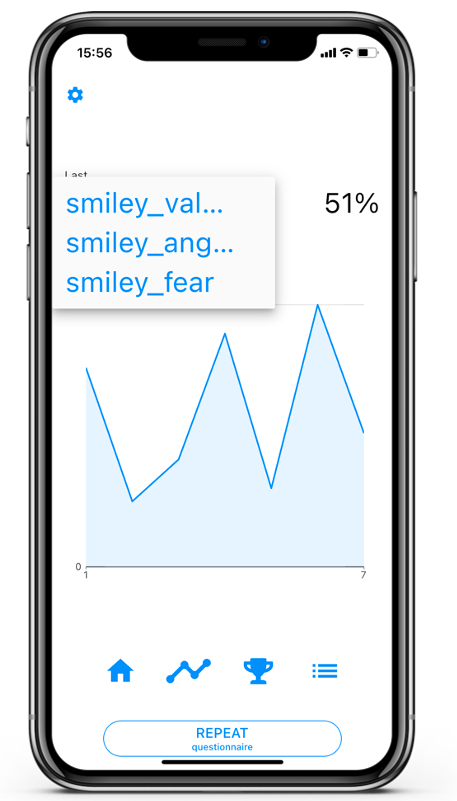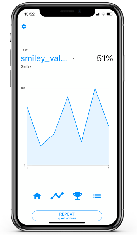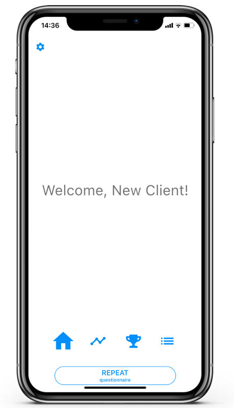 - State 3: The button reads ‘REPEAT questionnaire’. The client has filled in all questionnaires. If the client taps on the button he will be able to repeat the last questionnaire he or she filled in. Of course, clients will not be able to repeat questionnaires that have been given the ‘one time answer‘ mark.