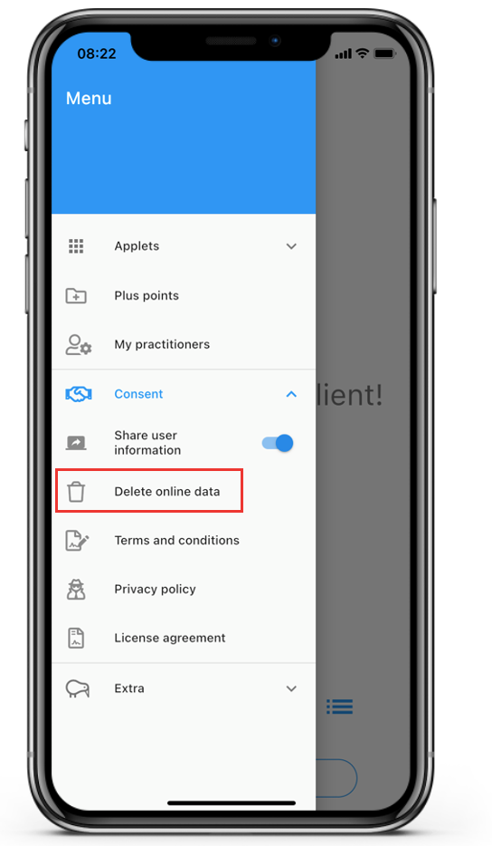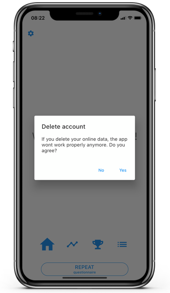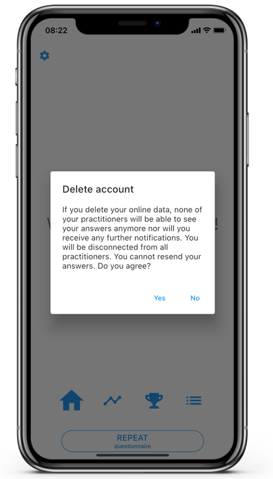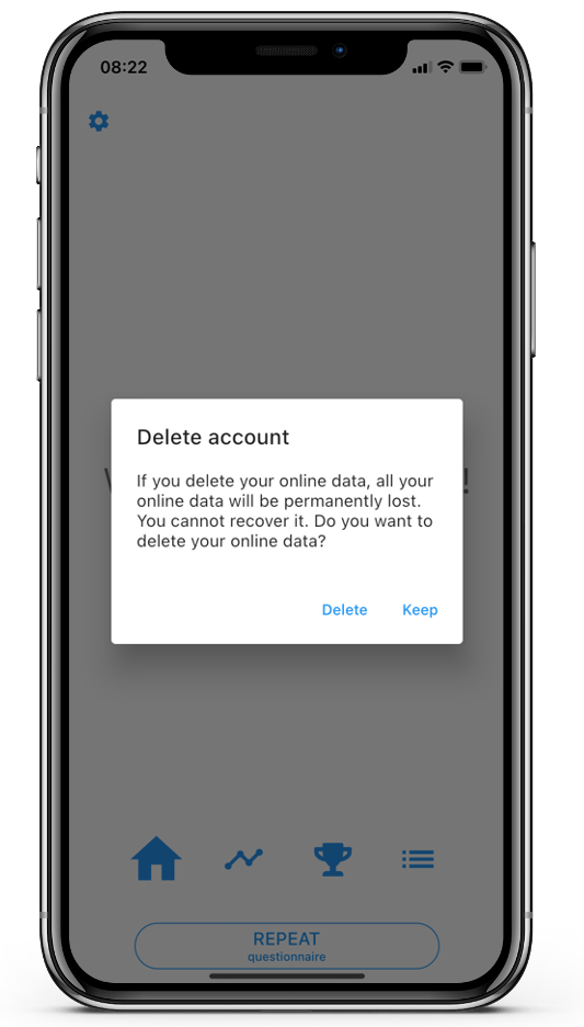 You can delete your online data via the app settings. If you delete your online data, your data will be deleted, you will be disconnected from all your practitioners/researchers and your app account will be deleted. To delete your online data, follow these steps: