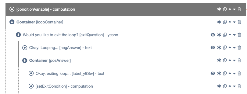 The structure of the example interaction. Note the first container, which is the loop, containing a single yes-no question.