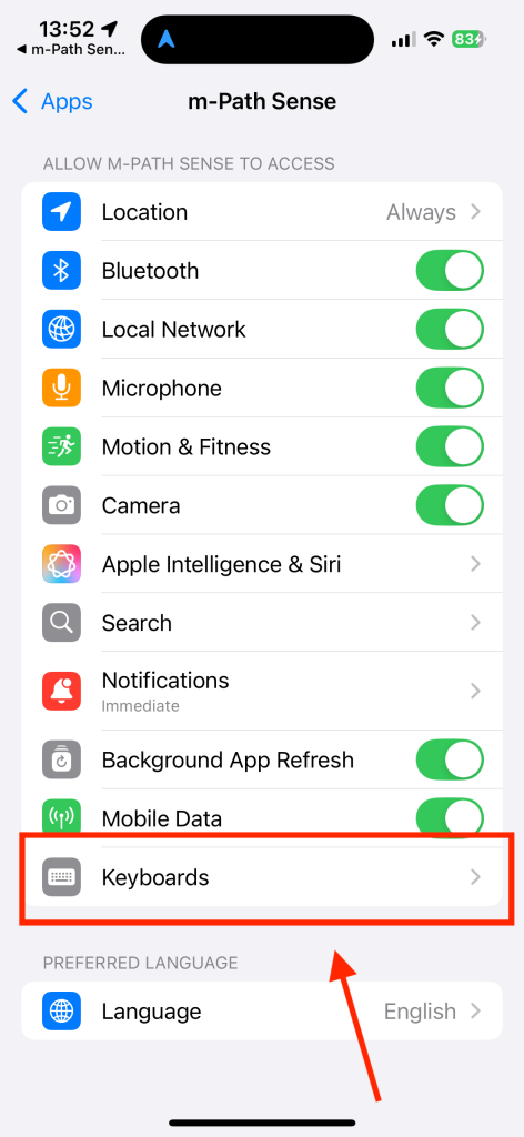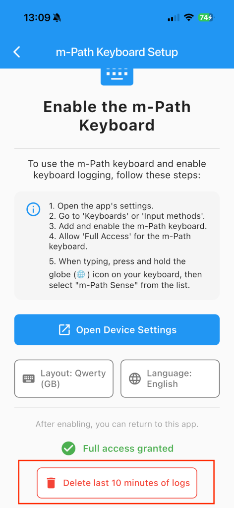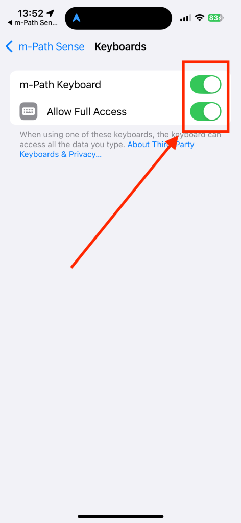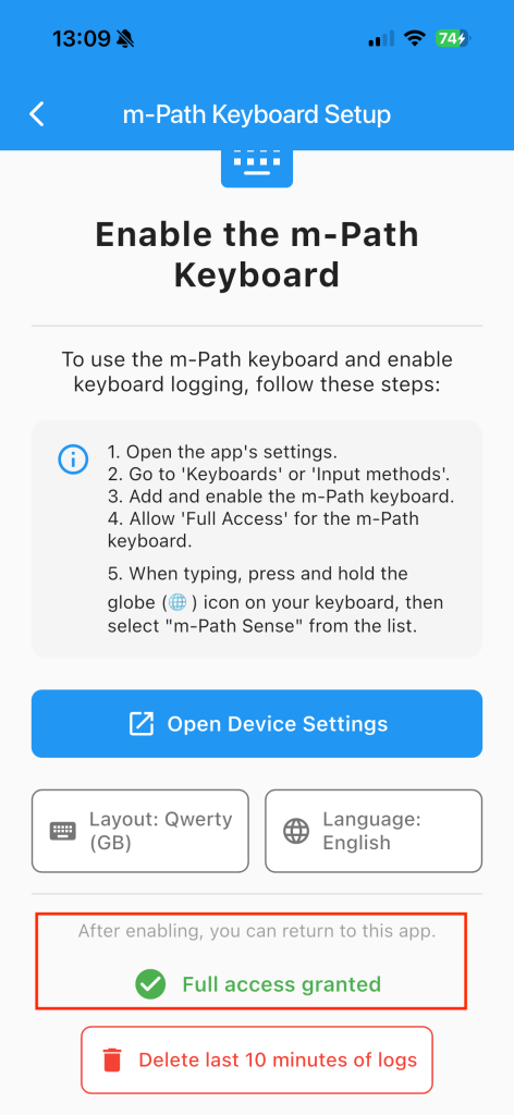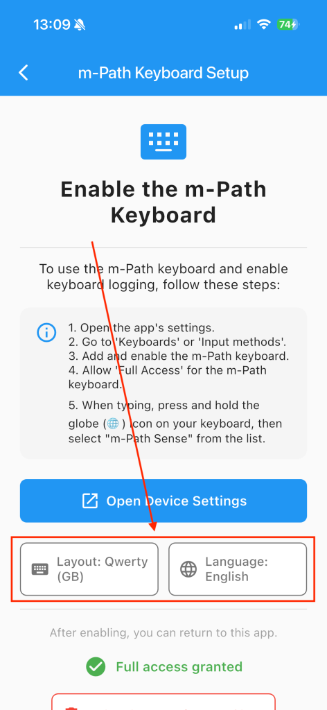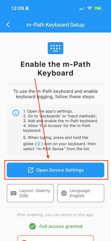 When you are on the keyboard settings page, please turn on the m-Path Sense keyboard and do not forget to turn “allow full access” on. This allows researchers to actually request the keyboard data.