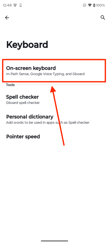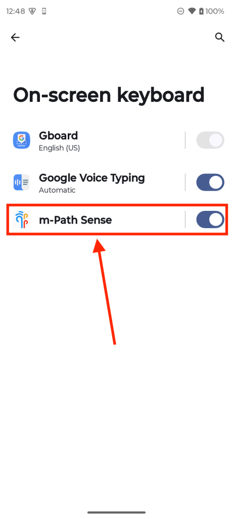 When using an Android device and clicking the “Open Device Settings” button in the m-Path Sense app, we will be redirected to the system settings on our phone. Once here, click System > Keyboard > On-Screen Keyboard, and toggle m-Path to on.