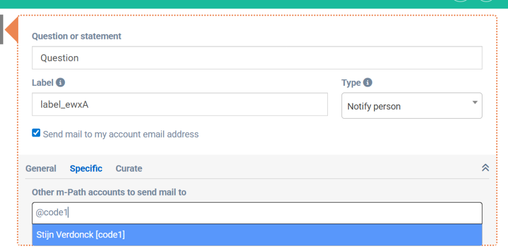 In other m-Path accounts to send mail to you can add other m-Path accounts that will receive an email. You can only add people with an m-Path account. You add people by adding their code (seen top left in dashboard). Anyone can create an m-Path account: https://manual.m-path.io/manual/knowledge-base/create-an-online-dashboard-account/.