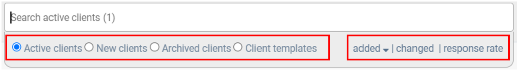 Your clients will automatically be sorted by the time they were added. You can also sort them by the latest changings or by response rate. This can be done by checking added, changed or response rate.