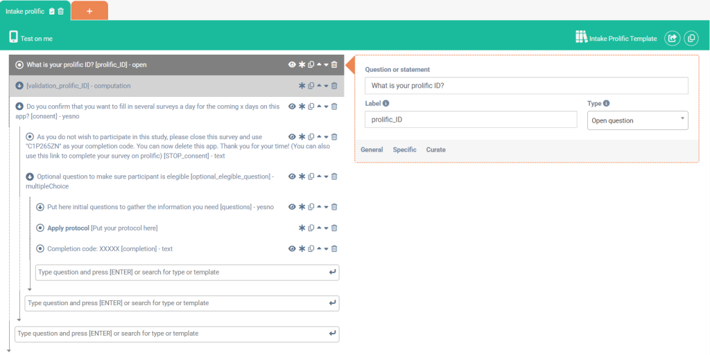 We created a template on the dashboard so you can get a headstart: Intake Prolific Template. If you don’t know yet how to make a questionnaire from a template from the library, we have a great explanation on it here: Use a questionnaire from the library.