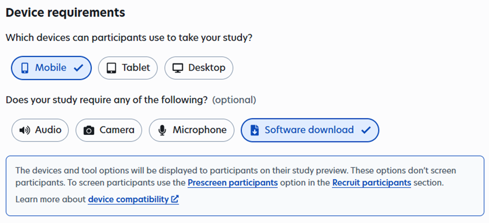 When setting the device requirements for your Prolific study, it is important to at least select “Mobile” and “Software download.” This ensures that participants can use the m-Path app on their smartphones, which is necessary for completing the study. If your surveys require additional features, such as audio recording, camera use, or microphone access, you can also select Audio, Camera, or Microphone accordingly.