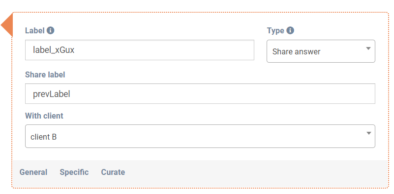 If you would like to share an answer from client A with client B, the questionnaire of client A should include a question with type Share answer. Fill in the label of the answer from client A that you want to share with client B and select client B in the With client box.