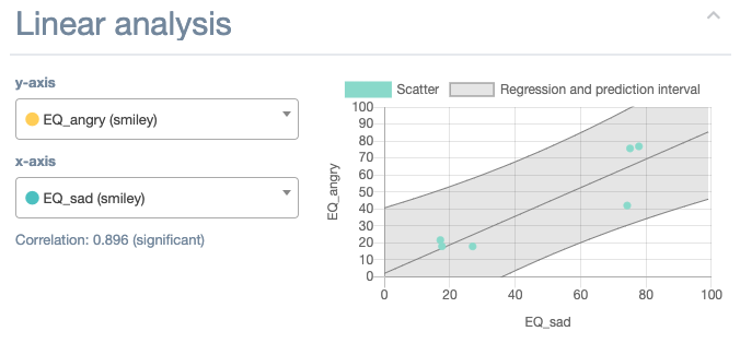 Under Linear analysis, you can check the relation between two items from the selected (quantitative) items. The dashboard will display a scatter plot of the two selected items and will compute their correlation. Based on these, the graph will also contain a regression and prediction interval.