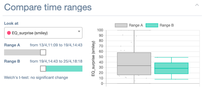 Under Compare time ranges, you can compare the client’s answers from two time ranges in terms of mean and variability by comparing the boxplots of these time ranges. Note that you can only select an item from the selected (quantitative) items.