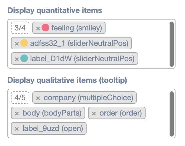By default, all variables with submitted values will be displayed. You can hide quantitative or qualitative variables by clicking the “x” next to their respective label. To unhide variables, click any empty space inside the label selection box. This will display a list with all available labels, in which you can check all labels you want to visualize.